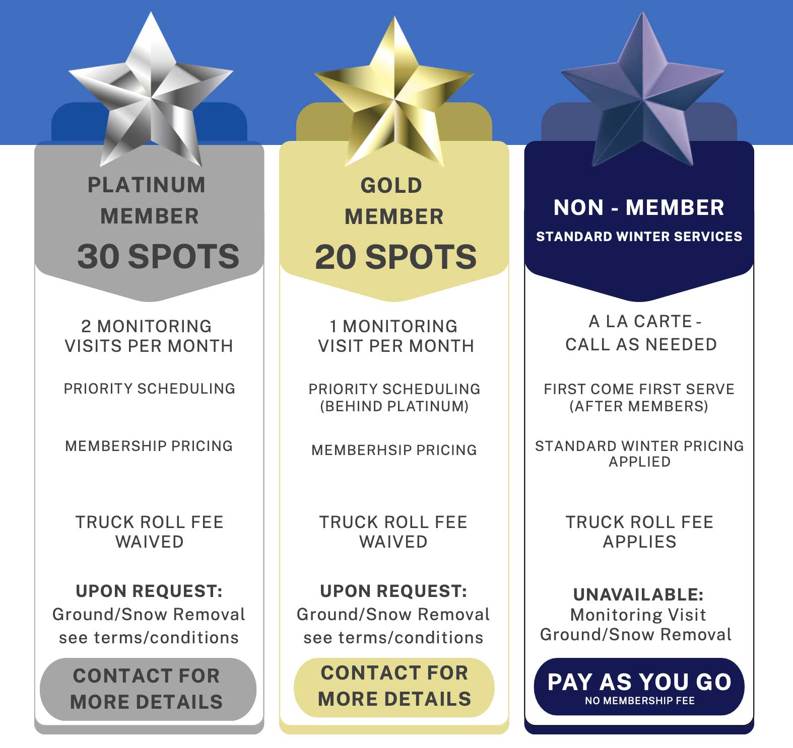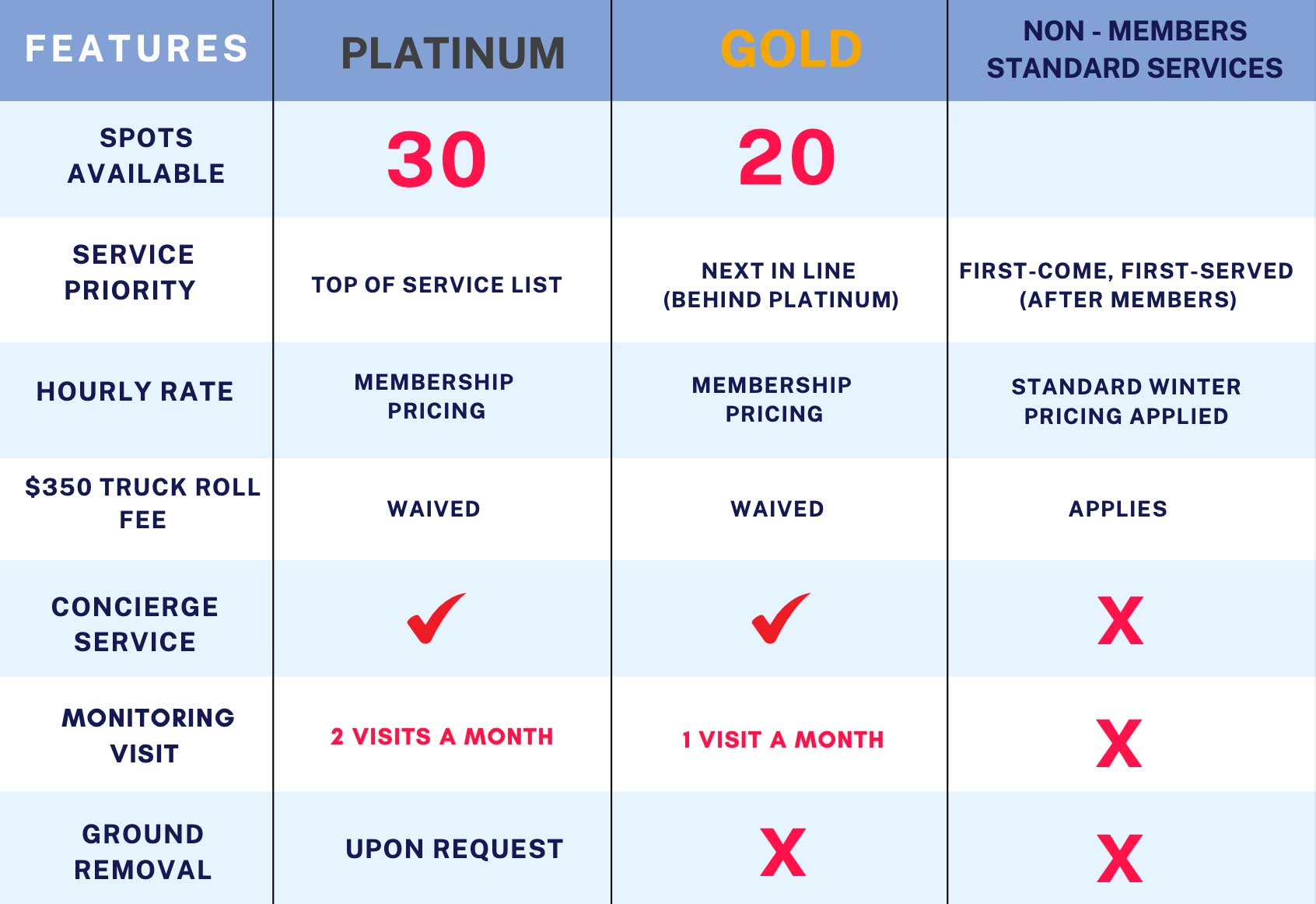 Platinum and Gold Membership Packages are available for single-family homes only. The Annual Membership Fee covers priority scheduling, truck roll fees waived, locked-in hourly labor rates, and exclusive access to ground snow removal services upon request. All work is still subject to additional charges depending on the scope of work to be completed.